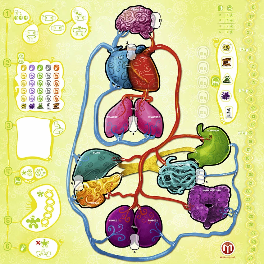 VIRALΒ is a 2-5 players competitive boardgame in which each player controls a virus that is growing inside a human body. Players will simultaneously play cards to place tokens on the board and move them around to gain control of zones to score Viral Points. Players also score points when they cause a crisis in an organ, thus activating the anti-virus (the immune system). Players also can play cards that allows them to attack other players. The player with the most Viral Points when the event deck runs out is the winner of the gameΒ VIRAL!