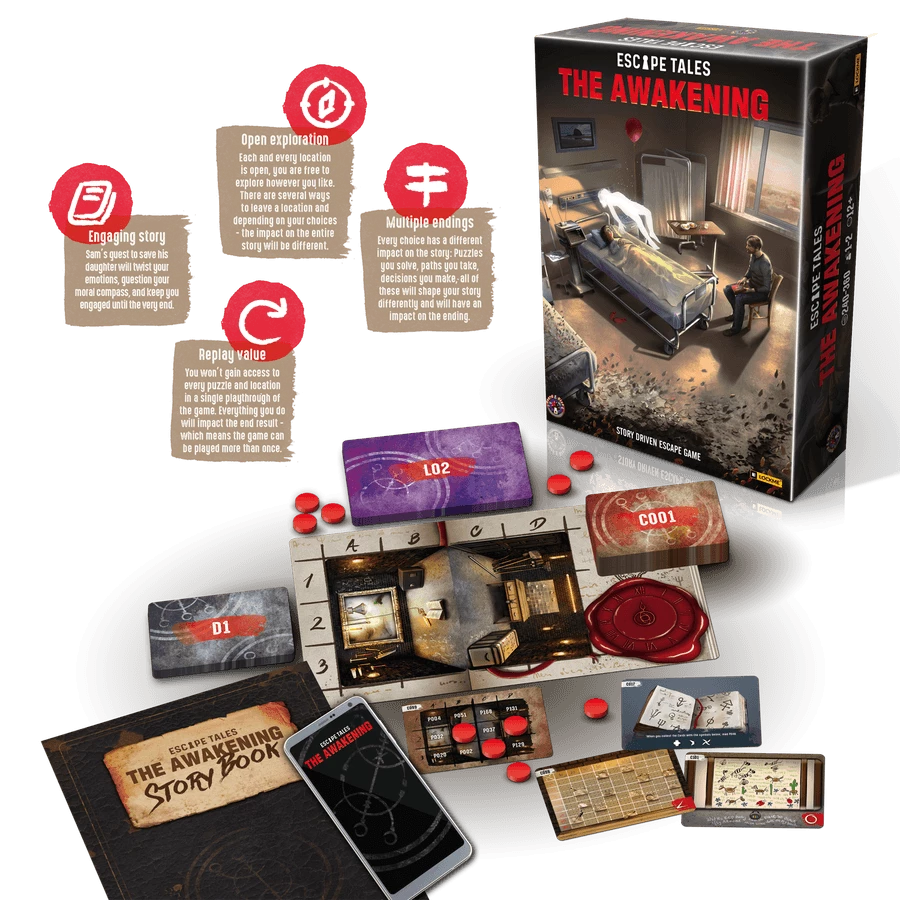 Escape Tales: The AwakeningΒ is a story driven escape room in card game form, with immersive exploration, no time limits when solving puzzles, and a collection of tough choices that will captivate and immerse you deeply. As for the story, here’s the set-up: