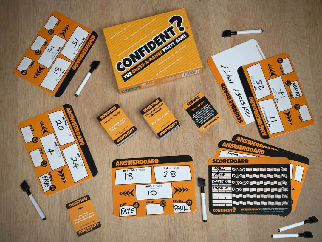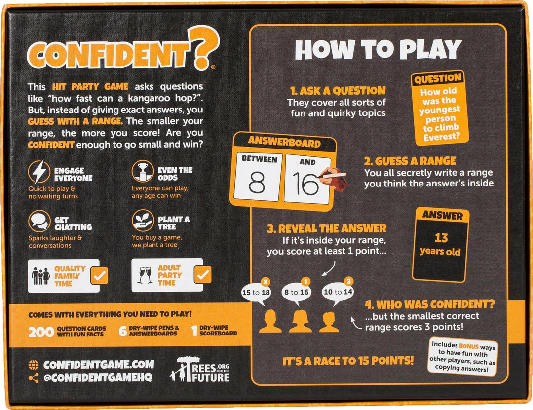 | CONFIDENT? is a highly entertaining family party game where you answer curious questions like how many slices are there in a loaf of bread?. But, instead of giving specific answers, everyone answers with a RANGE! You only need to get the right answer in your range to win points so everyone can have a go, but the smaller your range compared to everyone else, the more you score.Its for two or more people playing individually or in teams, great for adult game night, or to play with family. Suggested for ages 12+, but if you play in teams or pick the most suitable questions, even younger can play – as young as 8 and up to 98. Are you CONFIDENT enough to win? |