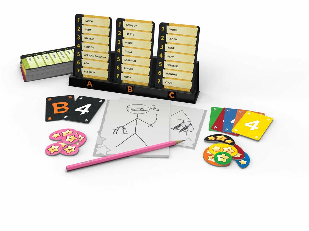 This second edition ofΒ PictomaniaΒ features revised word cards with a brand new look. One big change for this edition compared to the base game is that only three word cards are in play no matter the player count, allowing you to jump into each round more quickly since you don’t have to read as many words to guess who might be drawing what.