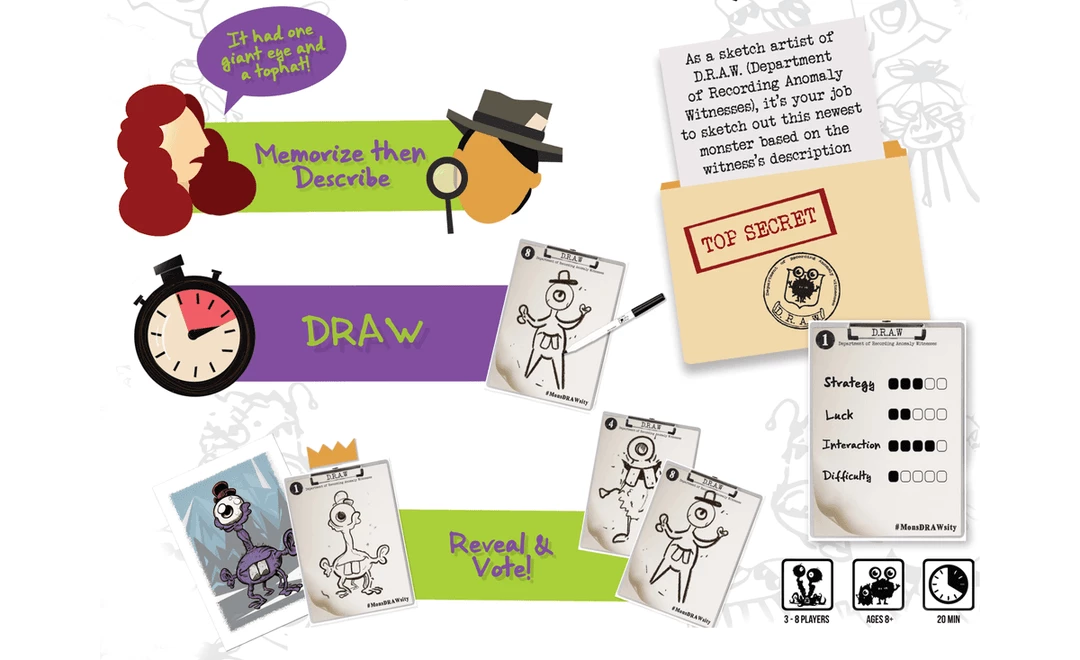 One player, known as “the Witness”, has twenty seconds to examine a picture of a bizarre-looking creature, then they must describe it to the rest of the players, known as “Sketch Artists”. At the end of the round, the witness awards points to the artist who was able to most closely match the monster seen by the witness!