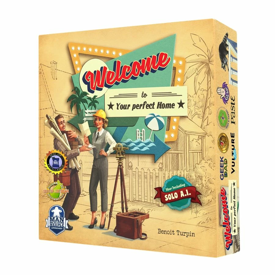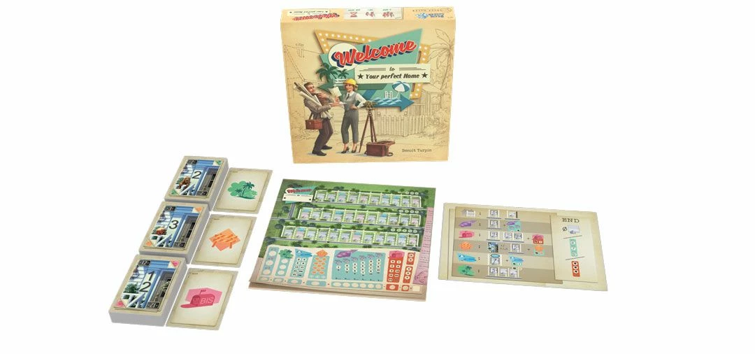 Welcome To…Β plays like a roll-and-write dice game in which you mark results on a score-sheet…but without dice. Instead you flip cards from three piles to make three different action sets with both a house number and a corresponding action from which everyone chooses one. You use the number to fill in a house on your street in numerical order. Then you take the action to increase the point value of estates you build or score points at the end for building parks and pools. Players also have the option of taking actions to alter or duplicate their house numbers. And everyone is racing to be the first to complete public goals. There’s lots to do and many paths to becoming the best suburban architect inΒ Welcome To…!