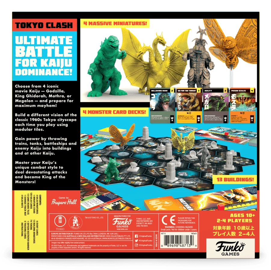 InΒ Godzilla: Tokyo Clash, you play as the Earth’s most fearsome Kaiju β Godzilla, Mothra, King Ghidorah, and Megalon β battling for dominance as the most terrifying monster in Japan. With detailed miniatures of the legendary monsters and a modular cityscape of 3D buildings to destroy, it’s an epic battle every time you play!