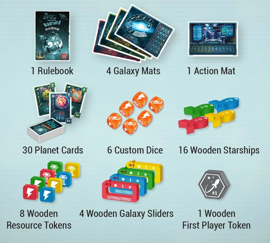 Tiny Epic Galaxies BLAST OFF! Will have you learning and teaching the game faster than ever! Immediately shuffle the Planet Deck, featuring 100% icon based abilities, set them in orbit and you are on your way.