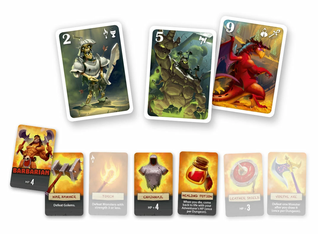 Welcome to the DungeonΒ β first released asΒ Dungeon of MandomΒ β is a push-your-luck dungeon delve in which 2-4 players take turns essentially daring each other to go into a dungeon with less equipment than they start off with while filling the dungeon with monsters. Players can win the game by winning 2 rounds or get eliminated from the game by losing 2 rounds. Each player has a 2-sided players card that has a white side and a red side. The first win taps the player card and the 1st loss flips the card over to the red side. A 2nd loss will have the player turn the card back into the box.