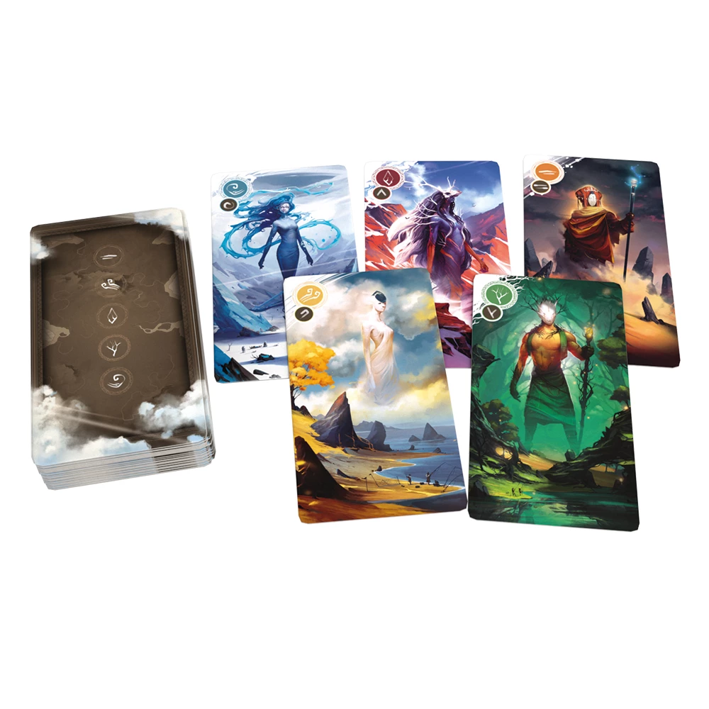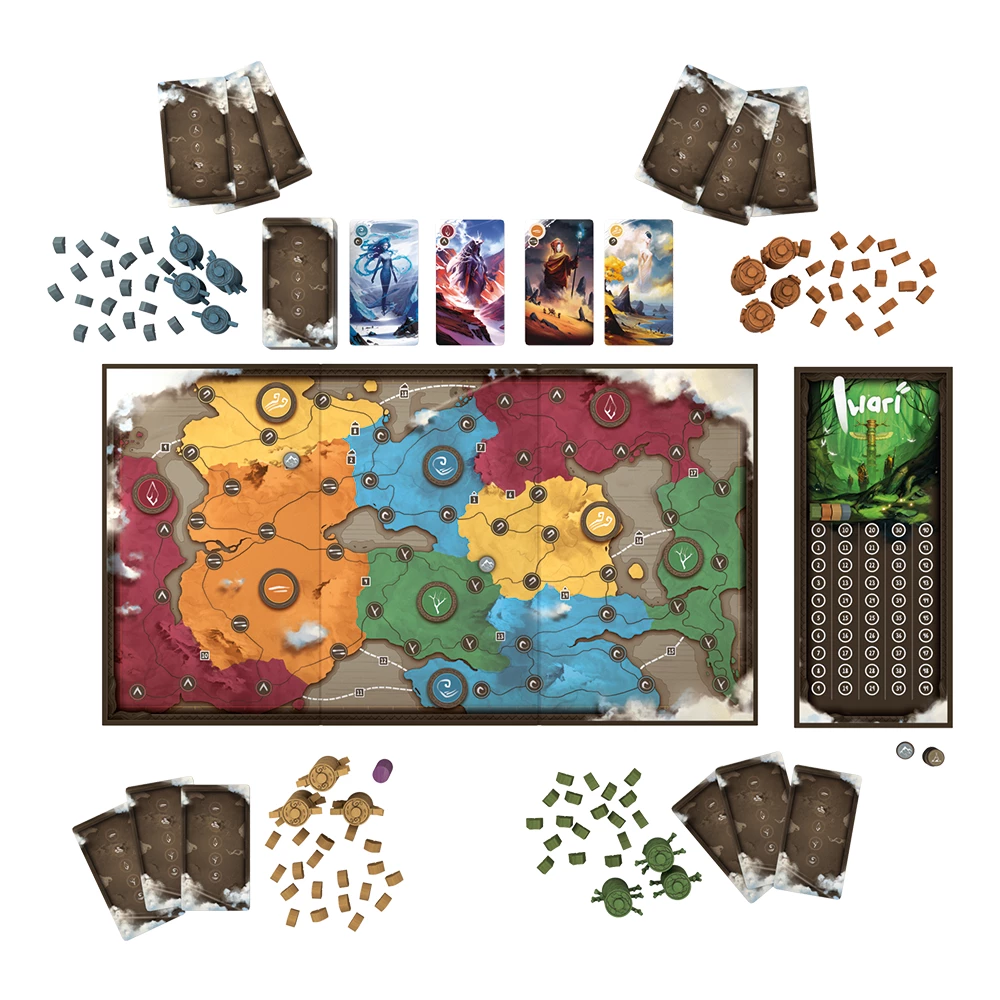 Iwari is an abstract-like Eurogame in which players represent different tribes looking for their identity by traveling around far lands and expanding their settlements into five different regions on the board.