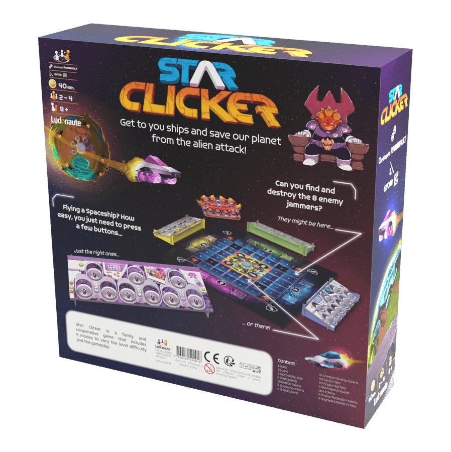 StarclickerΒ is a cooperative game in which you embody a pilot kid trying to save its planet from an Alien attack. At your turn, click and reveal one of the 9 buttons from your Spaceship Dashboard and do its action: move forward one tile, shoot, make a quarter turn or joker (choose among the 3 actions). When three of the buttons of the same zone are revealed, hide them. When you shoot a friend, shuffle the three buttons of the colour of the shot. When you shoot an alien ship, remove it from the board. When you land on a new tile, flip it to reveal its hidden face. There can be nothing, a meteorite or a satellite. When an alien ship reaches the planet, it damages its shield. Once there is no shield left the next damage is the last one and game is over. You and your team win when all the communication satellites have been repaired and before the mothership is empty or planet destroyed.