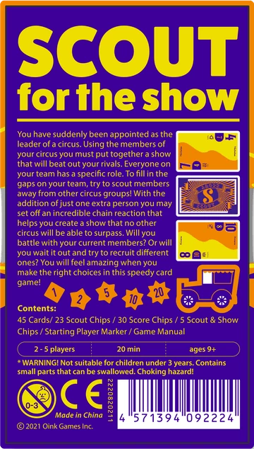 You have suddenly been appointed as the leader of a circus. Using your current members of your circus you must put together a show that will beat out your rivals. Everyone on your team has a specific role. To fill in the gaps on your team, try to Scout members away from other circus groups! With the addition of just one extra person you may set off an incredible chain reaction that helps you create a show that no other circus will be able to surpass. Will you battle with your current members? Or will you wait it out and try to recruit different ones? You will feel amazing when you make the right choices in this speedy card game!