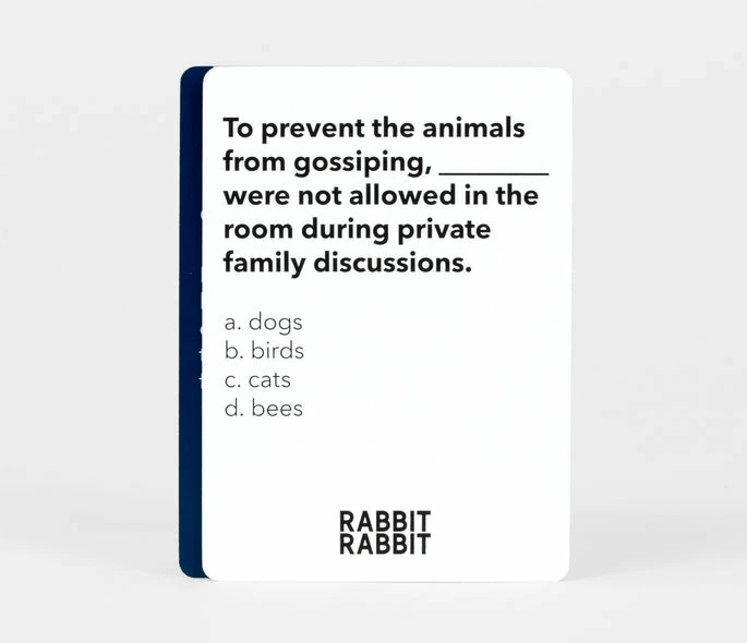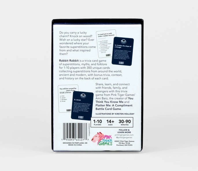 Rabbit Rabbit is a trivia card game of superstitions, myths, and folklore for 1-10 players with 350 unique cards collection superstitions from around the world, ancient and modern, with bonus trivia, context, and history on the back of each card.