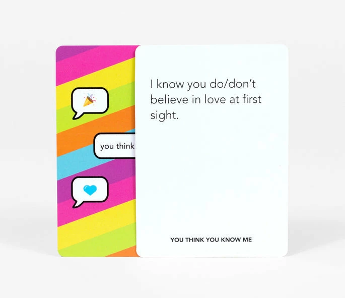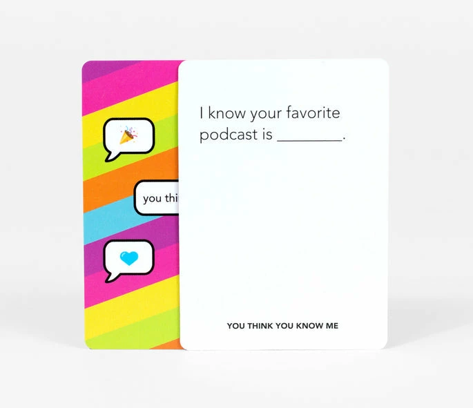 You Think You Know MeΒ playfully tests how well you know your friends, giving you a chance to learn more about what they love and who they are. Each player starts with seven cards in hand, cards that say things like “I know that your secret talent is ________” or “I know that you would/wouldn’t want to live forever.” On a turn, you pick another player, play a card from hand, and say how you think they would answer the question. If you’re right, you discard the card; if not, you have to draw a new card and add it to your hand. Whoever first discards all their cards wins.