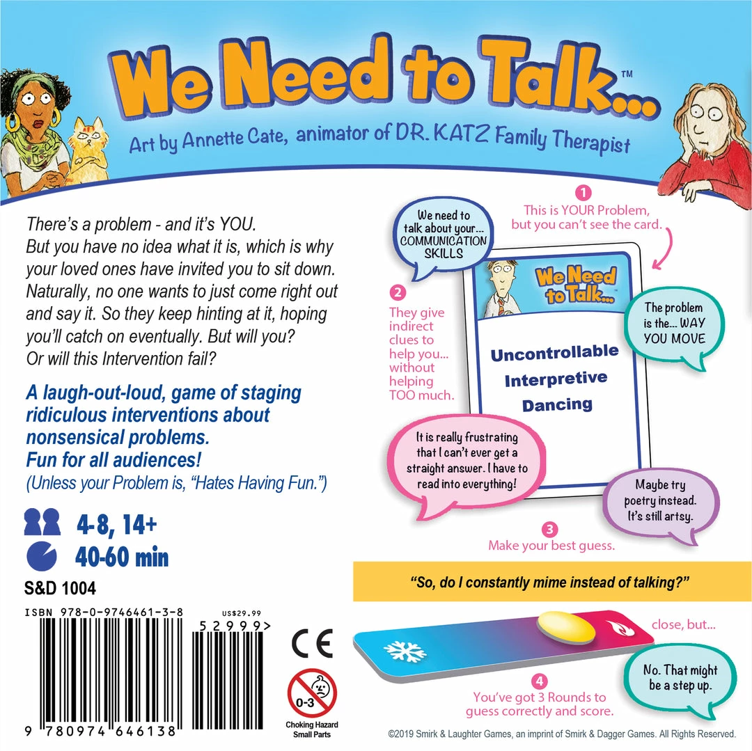 In ο»ΏWe Need To Talk, players take turns being the focus of an intervention by drawing a Problem card with a nonsensical problem like, “Uncontrollable Interpretive Dancing” or “Neurotic Inability to Turn Right”. They can’t see the card, but all the Concerned Friends and Family can. Friends will give obscure clues that hint at the problem, without giving it away. The sooner the Intervened can guess the problem, the more points they’ll score. The longer the Concerned Friends keep them guessing, the more points the Friends can earn. Each of the three rounds have a unique format for giving clues, Broaching the Subject, The Emotional Appeal and Offering a Solution. But if the Intervened cannot guess their problem by the end of the third round, no one will score any points, having failed to help their friend.