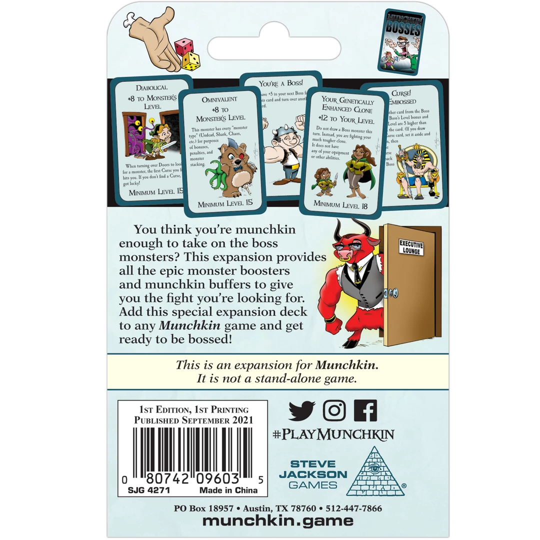 You’re pretty good atΒ MunchkinΒ β stabbed some friends, looted some rooms, killed a few monsters, won some games β and now you think you’re ready to take on the boss monsters. Well, look no further asΒ Munchkin BossesΒ has all of the epic monster boosters and munchkin buffers to provide any player with a battle royale (with cheese). Add this special expansion deck to anyΒ MunchkinΒ game and get ready to be bossed!
