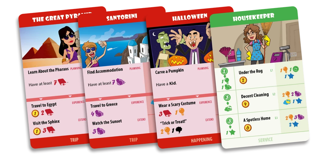 The Pursuit of Happiness: Experiencesย expansion introduces the concept of dreams. This new mechanism allows players to store cards of any type on their “dream” board, in order to make them a reality later in the game. The expansion also includes a new board to place the new Experience cards and features new actions. Within the Experiences deck, players will find a wide variety of trips and events around the world.